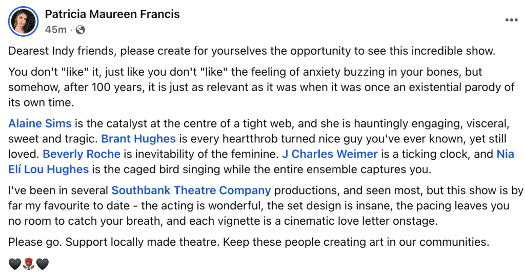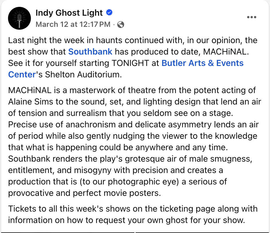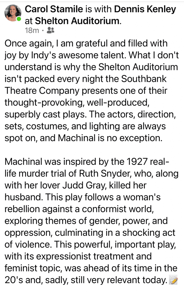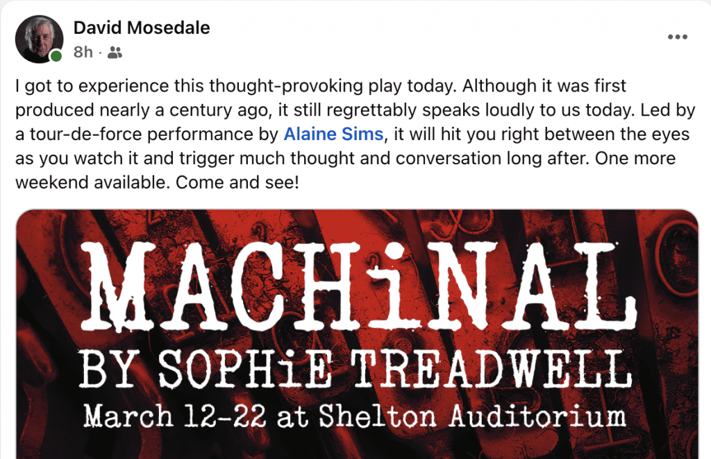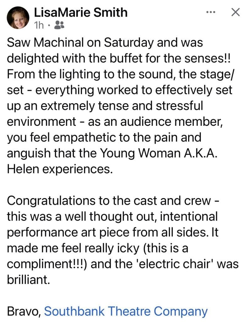 Our first weekend of Machinal had some wonderful reviews! You have four more chances to see what audiences are calling a “fascinating and unique theatre experience!” Check out what people are saying about this avant-garde piece on social media!
